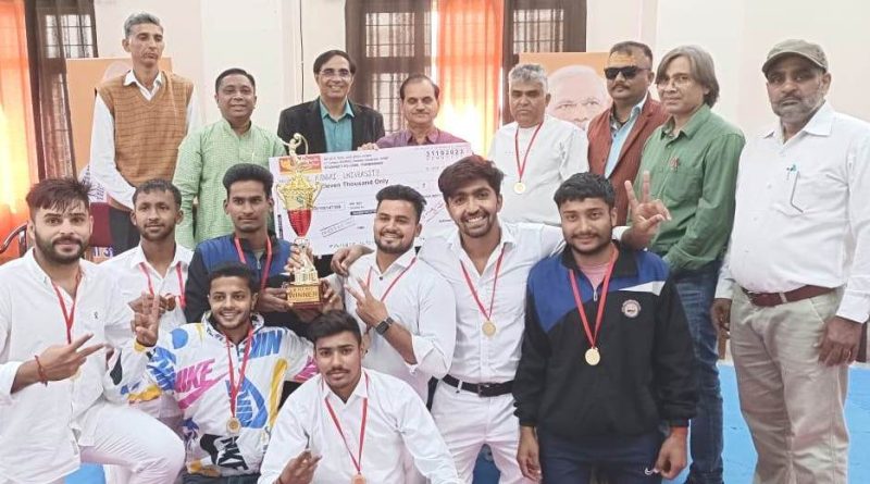 गुरुकुल कांगड़ी विश्वविद्यालय के शारीरिक शिक्षा एवं खेल विभाग में बुधवार को बास्केटबॉल तथा कबड्डी की विजेता टीम का सम्मान समारोह आयोजित किया गया। रूडकी इंस्टीट्यूट ऑफ टेक्नॉलॉजी द्वारा आयोजित इंटर यूनिवर्सिटी स्पोटेक चैंपियनशिप-2023 में गुरुकुल विवि की बास्केटबॉल तथा कबड्डी प्रतियोगिता में विजेता बनी है। टीम को ट्रॉफी, मेडल एवं 11000 रुपये का नकद पुरस्कार प्रति टीम लेकर चैम्पियन बनने पर दिया गया है। विश्वविद्यालय पहुंचने पर दोनों टीमों का कुलसचिव प्रो. सुनील कुमार और सचिव क्रीडा परिषद डॉ. अजय मलिक ने सम्मान किया। इस अवसर पर डॉ. शिवकुमार चौहान, डॉ. कपिल मिश्रा, डॉ. अनुज कुमार, डॉ. प्रणवीर सिंह आदि मौजूद थे।